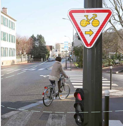 " Le code de la route permet aujourd’hui d’instaurer des cédez-le-passage cyclistes aux carrefours pour les mouvements de tourne-à-droite, tout droit et de tourne-à-gauche afin de faciliter la circulation des cyclistes. Moyennant la mise en place de la signalisation adaptée, il permet aux cyclistes de franchir le feu rouge sans marquer l’arrêt sous réserve de céder le passage à tous les usagers, en particulier les piétons, bénéficiant du feu « vert ». Le feu rouge devient un cédez-le-passage pour les cyclistes pour la ou les directions indiquée(s). La Communauté d’agglomération Saint Germain Boucles de Seine s’engage à soutenir financièrement les communes pour la mise en place de ce dispositif".